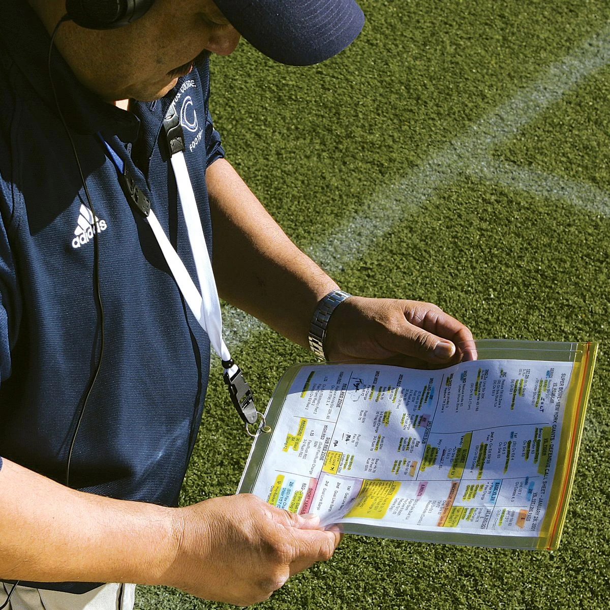 Have you ever wished that you had a third hand during games or practices? The Fisher Coach’s 3rd Hand is the answer! The 8.5″ x 11″ three pack of standard size game plan protectors means no more folding, rolling, or laminating. This is an indispensable aid for practice or games because it protects your game plan in all weather conditions with a zip lock seal. Easily write your adjustments on the vinyl pocket with a grease pencil. The detachable and adjustable lanyard keeps your hands free while you work.