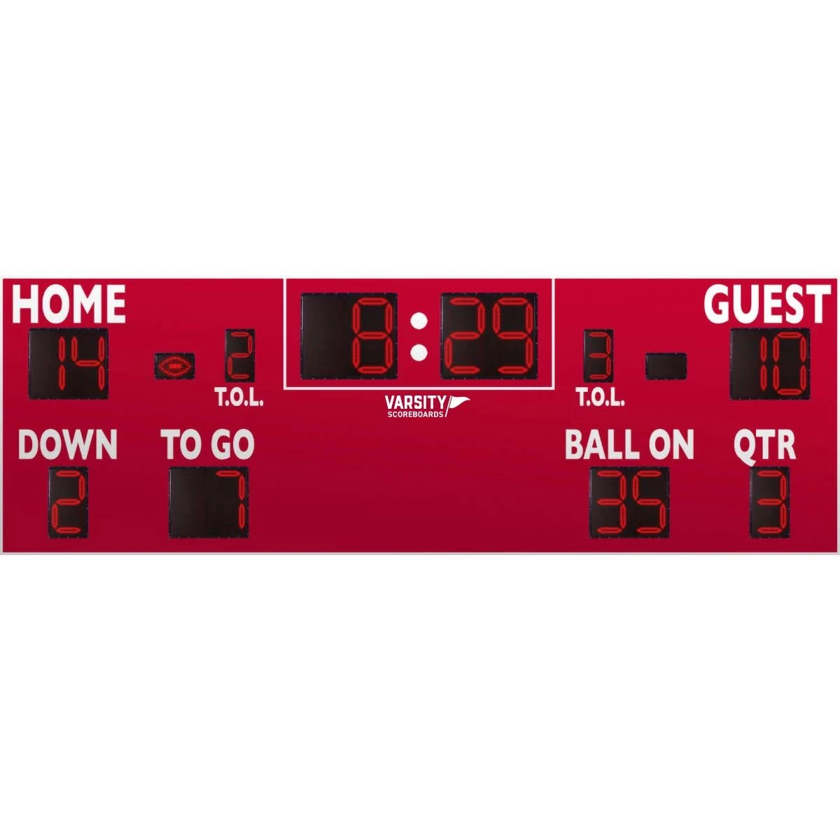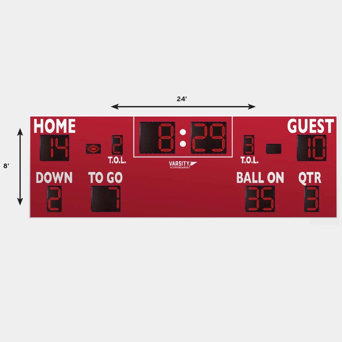 The 7424 Football Scoreboard by Varsity measures 24′ W x 8′ H x 8″ D and features super-bright 26″ & 20β high digital LED numerals that are 100,000 hour-rated and are visible from over 300 feet away. The scoreboard’s 22-gauge galvanneal steel cabinet is fortified with a powder-coat finish that provides durability and will keep this scoreboard looking brand new for years! The 7424 scoreboard package includes a wireless remote control, digit protective shields, a junction box cover (cable models only), mounting rails and a CD that contains complete operation/installation/service manuals, and 5-year limited warranty details.