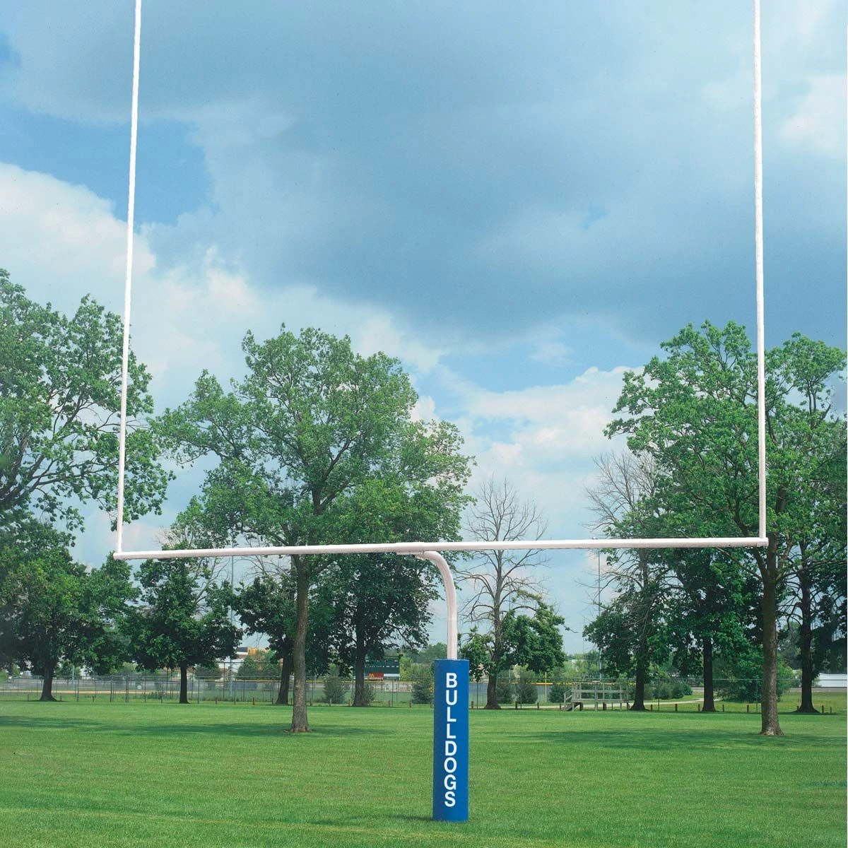 The popular 4-1/2″ gooseneck styling and Bison’s exclusive PerfectGoal design makes these NFHSย goal posts an excellent choice for your high school football facility. ย These goal posts have a 5′ setback from the end line for safety and a tough, powder coated paint finish that gives the goal posts and attractive finish for many years.ย The goals are constructed ofย 20’H aluminum uprights and a 4-1/2″ steel tube main upright and crossbar.ย Bison’s Perfect Goal design allows forย easy installation andย precise adjustment of the crossbar and uprights after installation of the main upright.