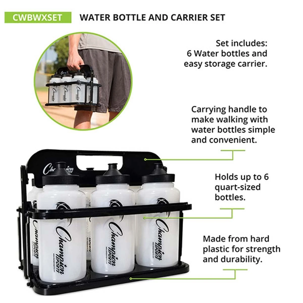 - Includes 6 water bottles and easy storage carrier