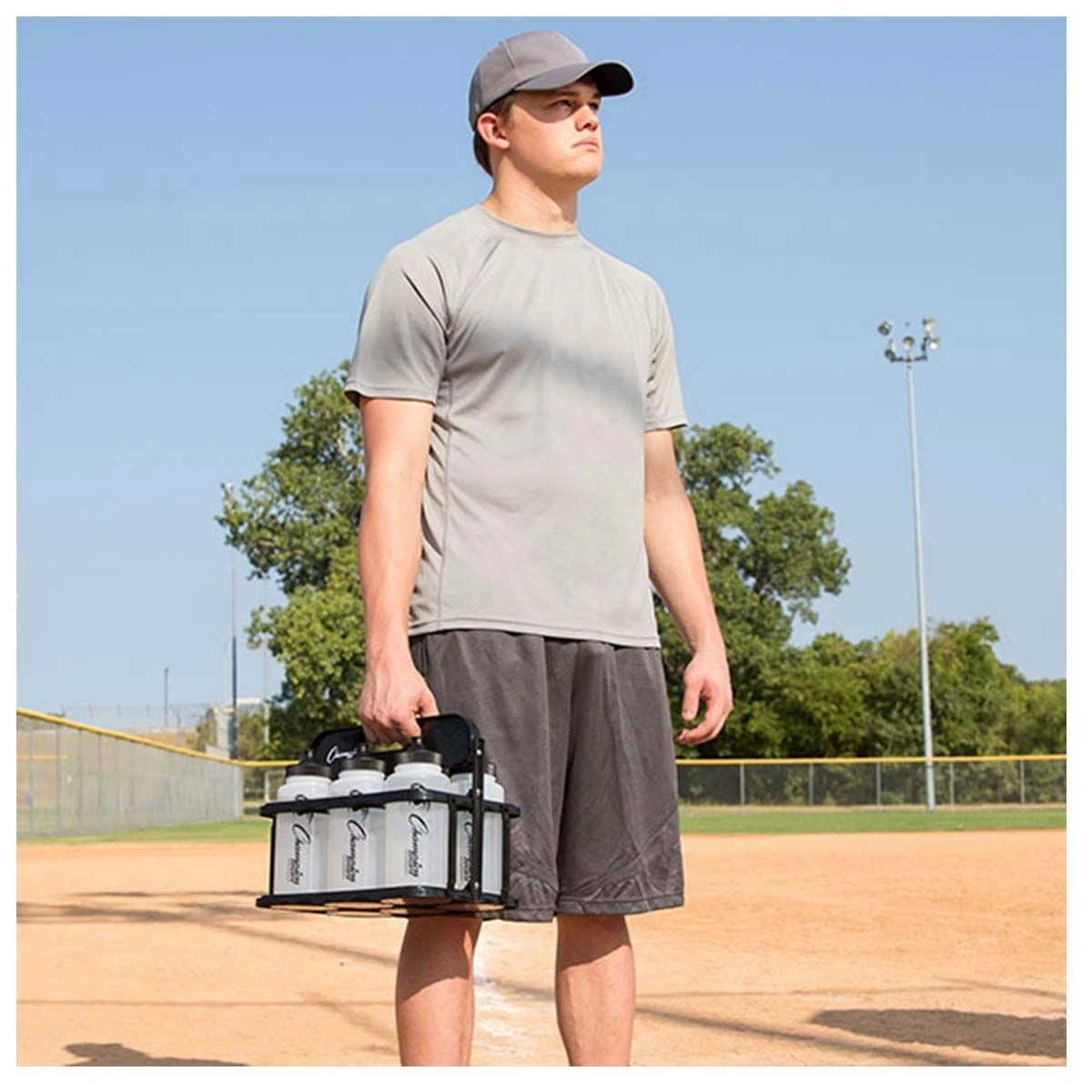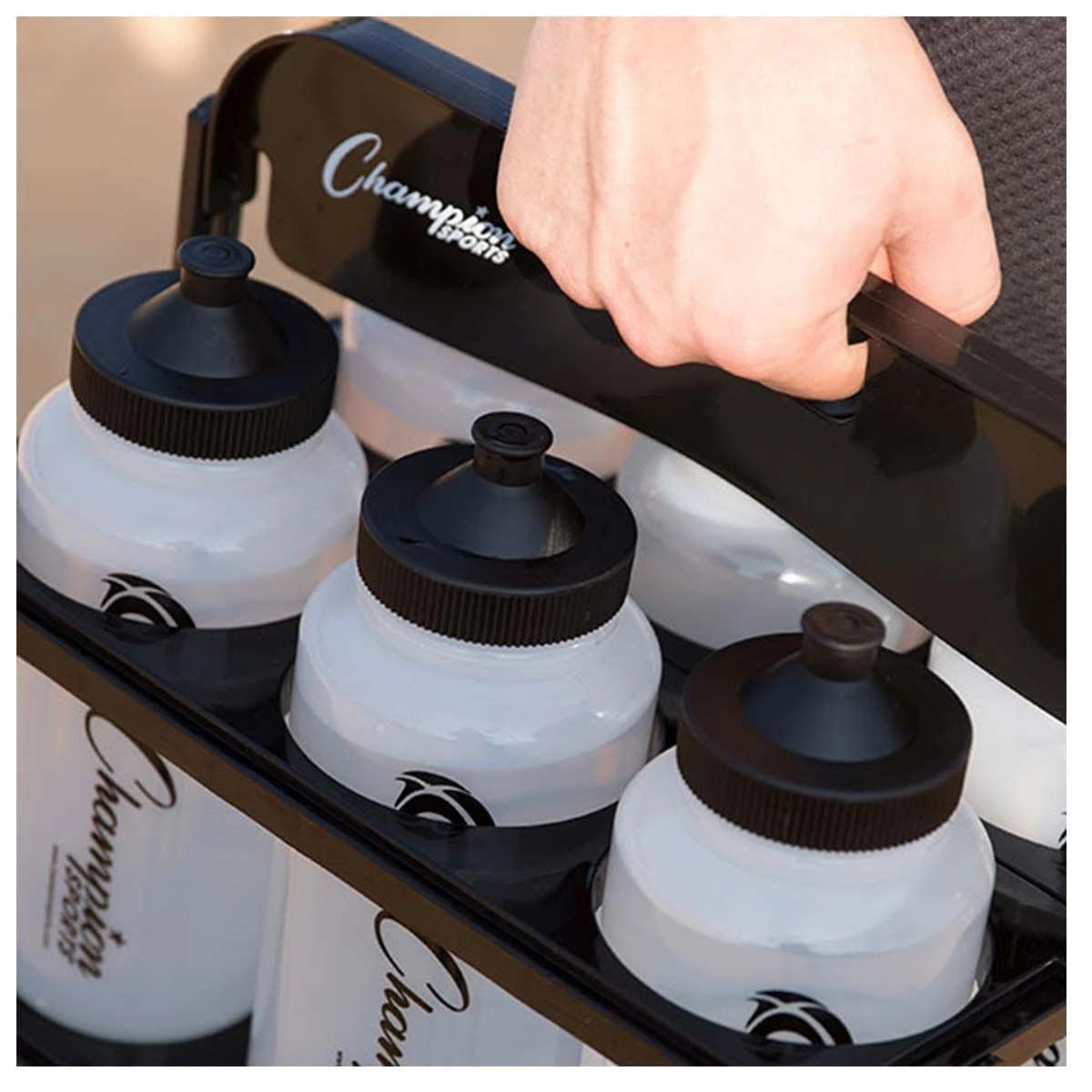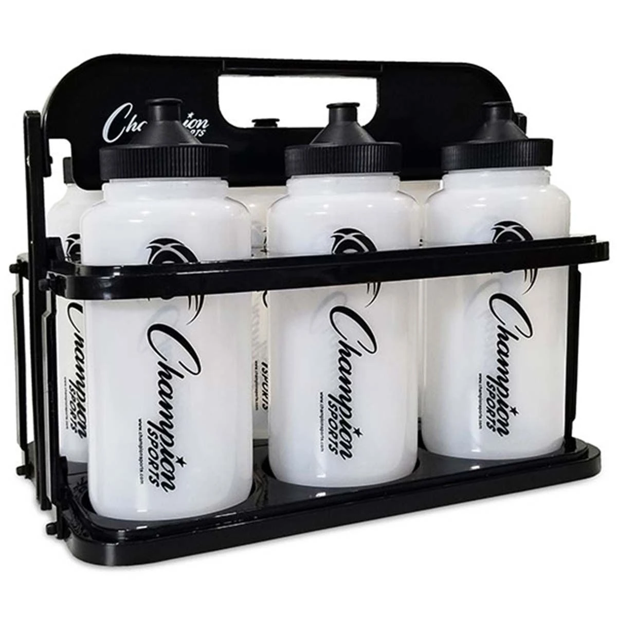 This water bottle and carrier set includes six 1-quart polyethylene squeeze bottles and a collapsible carrier. These comfort-grip squeeze bottles have a push/pull lid and high volume flow for reducing germ transfer and a wide opening for easily adding ice.