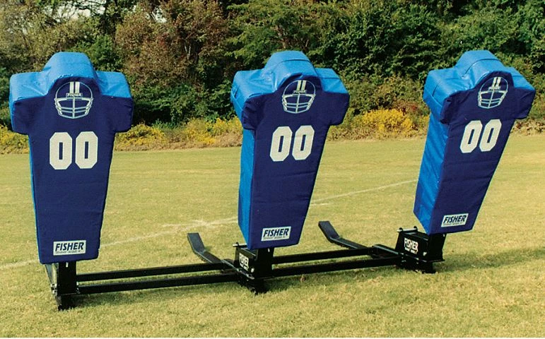 The Big Boomer 3 man blocking sled from Fisher give players a realistic fulcrum pivoting action so they can achieve leveraged power over an opponent without losing their balance. Coaches choose this product because this sled is completely customizable by adjusting spring tension, pad height and pad angle. The pad height and three pad angles are adjustable with a single pin to put the player in a good football position.Each blocking unit is made up of “pigs” and pads. The “pig” is constructed with a high strength 1/4″ steel plate, double welded for maximum strength and durability. The “pig” attaches to the steel chassis and is fully adjustable. The spring tension adjustment is an integral part of each “pig”. The pad fits onto the “pig” and is fully adjustable. All metal surfaces are powder coated to prevent rust.Each Boomer sled pad has a core that is built from high density, 100lb impact resistant foam. The durable 18oz vinyl covers are then double and triple stitched to withstand harsh weather and years of hard use.