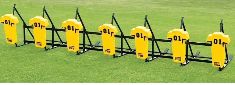 This Fisher CL JV 7 man sled is ideal for middle school through high school programs because of its TITE-LOCK modular chassis that provides the rigidity needed in a multi-unit sled. Player safety is improved due to the wraparound design of the Man Pads.The main frame is tough, durable and guaranteed to last for 5 years. The all metal surfaces are powder coated to prevent rust and the leaf spring design virtually eliminates all spring cracking and breaking. The 30 degree angle on the skids assures you of a smooth transition over your field without chewing up your turf or grass. The high density, 100lb impact resistant foam is covered with durable 18oz vinyl covers that are then double and triple stitched to withstand harsh weather and years of hard use.