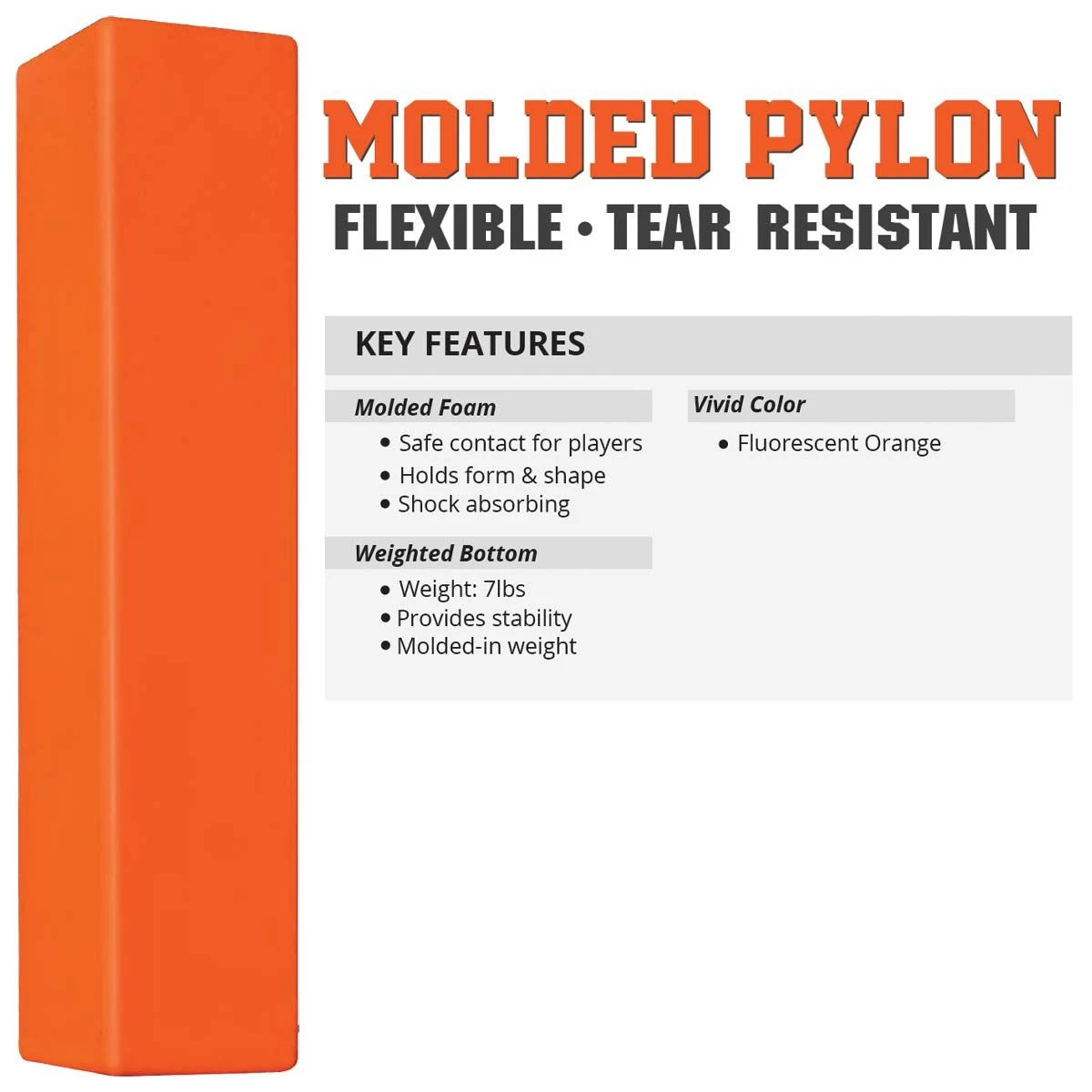 This set of 4 molded end zone pylons from Fisher are flexible and tear resistant, holding up to the toughest hits during a game. TheΒ fluorescent orange pylons are made out of molded foam that hold their form and shape and are shock absorbing, making it safe when players make contact. The weighted bottoms provide stability so you donβt have to worry about them falling over on their own.