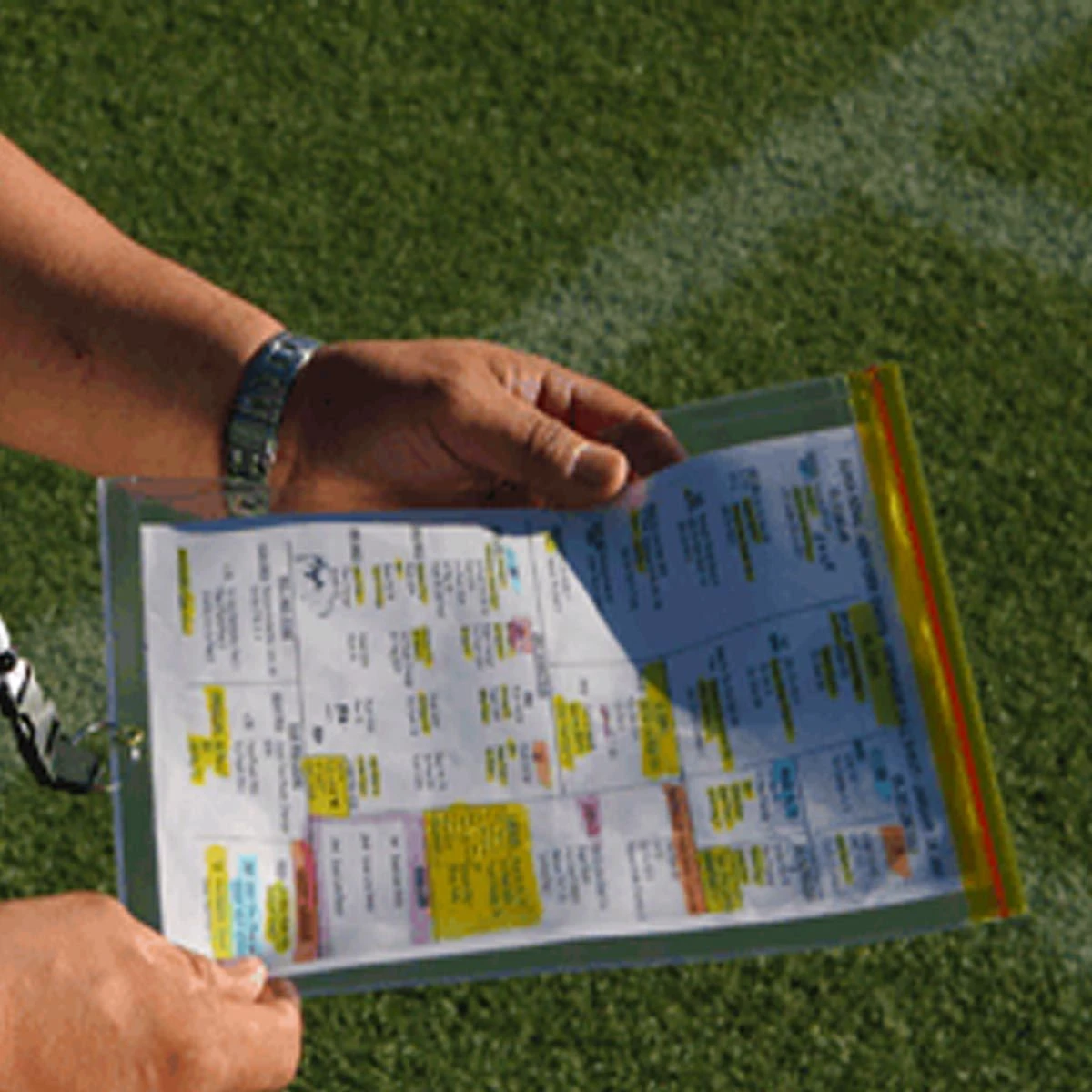 Have you ever wished that you had a third hand during games or practices? The Fisher Coach’s 3rd Hand is the answer! The THCombo pack of game plan protectors includes a standard size set, legal size set, and standard double size set. This means no more folding, rolling, or laminating. This is an indispensable aid for practice or games because it protects your game plan in all weather conditions with a zip lock seal. Easily write your adjustments on the vinyl pocket with a grease pencil. The detachable and adjustable lanyard keeps your hands free while you work.