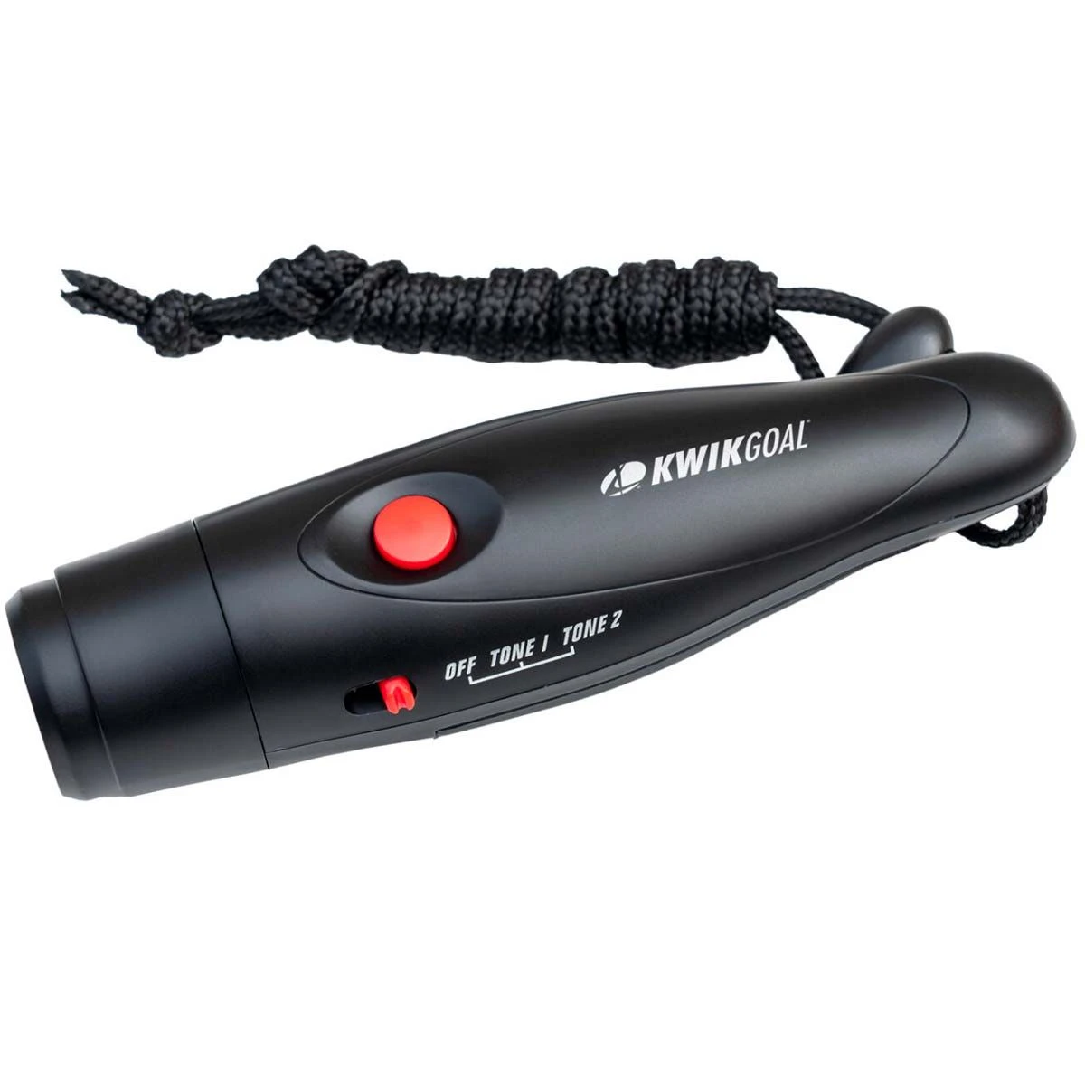 The Kwik Goal 2-Tone Electronic Whistle provides a sanitary alternative to the standard whistle, offering two loud and distinct whistle tones with the press of a button. The two 125 dB tones make the signal easily distinguishable between fields and courts, eliminating confusion among players. Batteries and lanyard included.